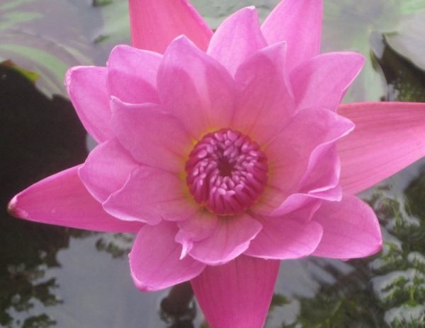 Evelyn Randig has deep raspberry pink flowers opening with a cup shape and then becomes a star with a slight fragrance. The pads are dazzling deep green with maroon mottling. Medium size.